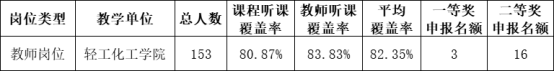 二、指标数量:按照《广东工业大学本科教学工作激励办法》规定和教学指导委员会会议精神,各教学单位申报教学优秀一等奖和二等奖的总名额指标不超过本学年度在编在岗教师人数的15%,同时考虑过去一年课程听课覆盖率和教师听课覆盖率,最后我院具体指标数如下:
