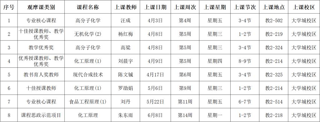 教学观摩活动期间,学院全体教师参加的教学观摩课程不少于2节,学院35岁以下(含35岁)青年教师或近3年新入职教师,本学期参加观摩课程不少于4节,请各位老师积极参加,并自行打印《轻工化工学院观摩课听课表》(见附件)前往听课,结束后将听课记录表交给任课老师签名后交至工四201-3刘老师处,学期末将统计各位老师的参与情况,谢谢。