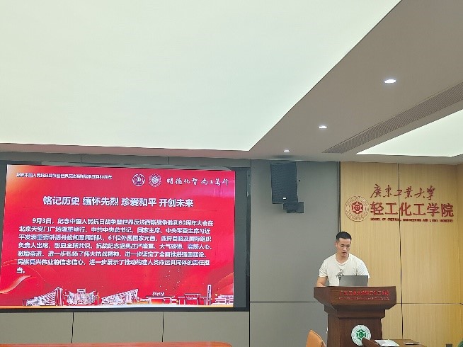 研究生会团支部开展了“纪念中国人民抗日战争暨世界反法西斯战争胜利80周年”主题团日活动。通过重温抗战历史、弘扬伟大抗战精神,激励研究生骨干铭记历史、珍爱和平,进一步增强民族自豪感和时代使命感。主题团日活动强调,要将抗战精神转化为学习科研的强大动力,以更加昂扬的姿态投身强国建设、民族复兴的伟大征程。