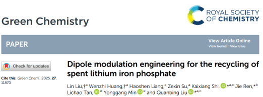 近日,广东工业大学轻工化工学院2022级能源化学工程一班本科生刘琳,以第一作者身份在化学领域国际知名期刊Green Chemistry(《绿色化学》,IF=9.2)上发表最新研究成果。该研究聚焦废旧磷酸铁锂正极材料高效回收领域,提出双共晶锂盐偶极调控工程技术,实现废磷酸铁锂电池高效回收,论文题为“Dipole modulation engineering for the recycling of spent lithium iron phosphate”。