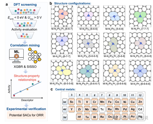 单原子催化剂以其原子级分散的活性位点和卓越的催化性能成为催化研究的前沿,本研究创新性地融合高通量DFT计算与机器学习数据挖掘,系统筛选了26种过渡金属中心与12种配位构型的组合,从复杂数据中提炼出关键描述符Eemb/sin(CN),该描述符同时量化了金属-载体相互作用强度与配位几何环境,统一解释了前过渡金属(如Mn、Fe)需高配位削弱过强氧吸附、后过渡金属(如Cu、Pd)可通过低配位增强中间体结合的规律。基于此设计原则,团队通过缺陷工程策略精准合成了富含Cu–N₃基元的Cu-SA/N–C催化剂,实验表征证实其局部配位结构以吡咯型氮为主,与传统Cu–N₄位点相比表现出显著优化的ORR活性:半波电位达0.886 V(vs. RHE),超越商业Pt/C(0.872 V),锌空气电池峰值功率密度达191.3 mW cm−2,并具备长期稳定性。