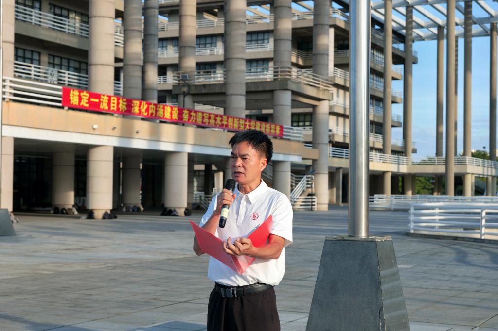 为进一步增强学生爱国荣校意识,弘扬爱国主义精神,10月20日清晨,我院在大学城校区正门广场开展了“铭记历史当自强 奋勇逐梦谱华章”升国旗主题教育活动。学校心理健康教育中心主任罗嘉文、学院党委书记周东斌、副书记杨刚、离退休教授梁亮,辅导员老师以及2025级食品科学与工程、应用化学专业218名学生参加升国旗仪式。升旗仪式由2025级辅导员郭佳欣主持。