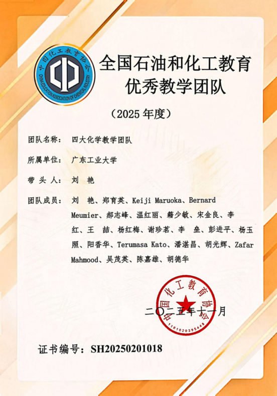 近日,中国化工教育协会公布了2025年全国石油和化工教育优秀教学团队等认定结果。我院基础教学中心四大化学教学团队荣获“全国石油和化工教育优秀教学团队”称号。本次评选旨在深入贯彻落实党的二十大和全国教育大会精神,依据《教育强国建设规划纲要(2024—2035年)》相关要求,表彰在服务石油化工产业发展、提升教育教学与人才培养质量方面贡献突出的集体和个人。