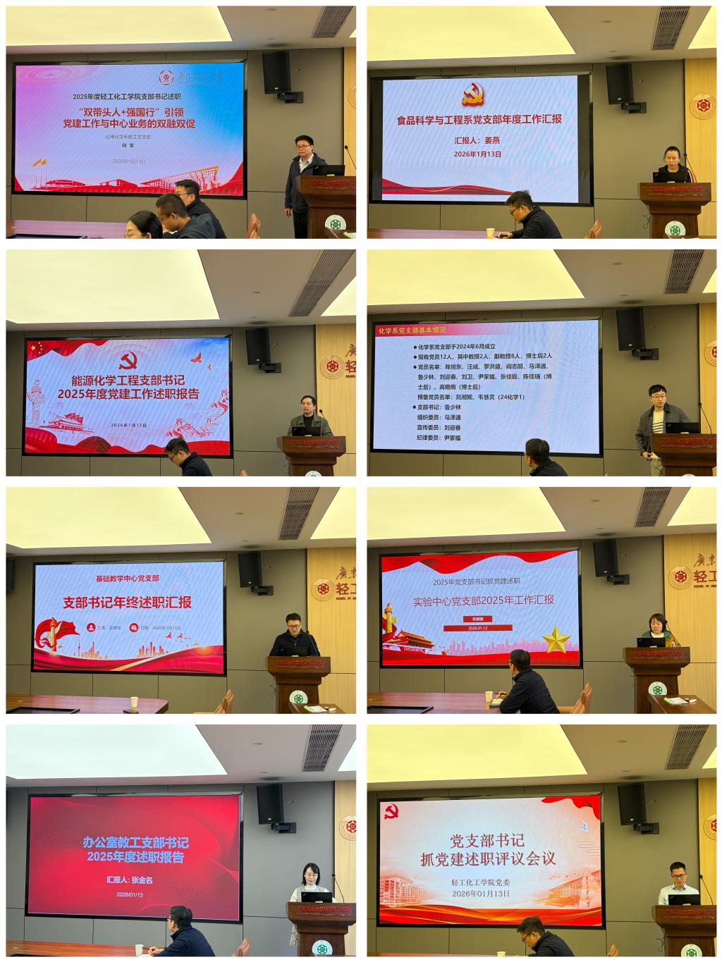 全部师生党支部书记向学院党委提交本年度抓党建工作述职报告,其中8位教工党支部书记进行现场述职。各党支部书记围绕履职尽责情况、工作理念与举措、支部工作开展情况等方面展开汇报,总结成效亮点,剖析问题不足,提出未来工作思路与举措。