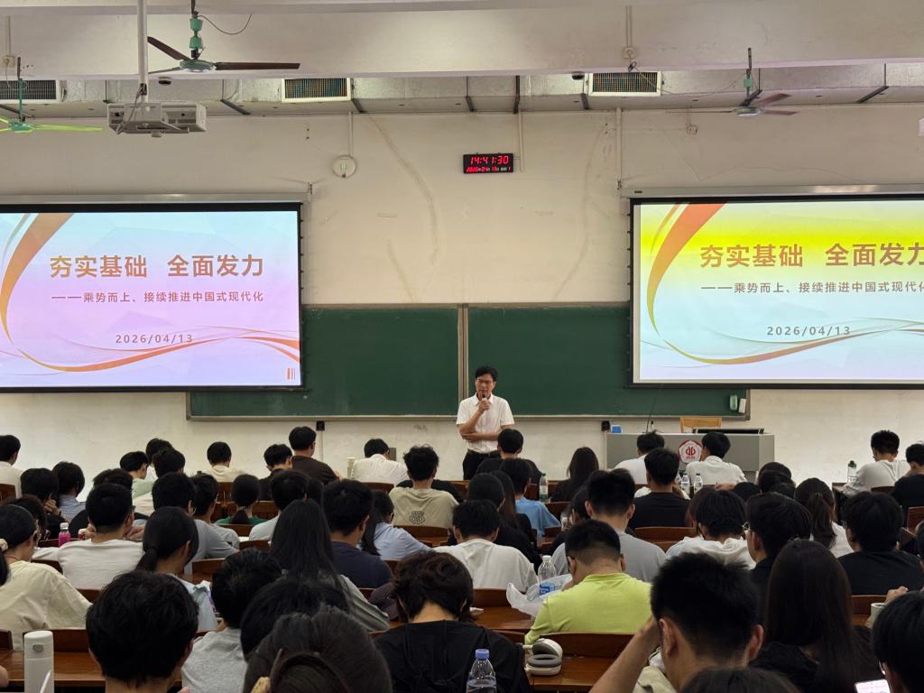为深入学习贯彻习近平新时代中国特色社会主义思想,落实立德树人根本任务,4月13日,轻工化工学院党委书记周东斌以《夯实基础 全面发力——乘势而上、接续推进中国式现代化》为题,为2025级应用化学、食品科学与工程专业全体本科生讲授“思政第一课”。