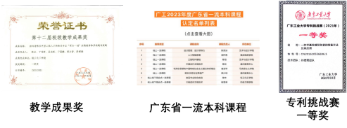 荣获第十二届校级教学成果奖一等奖,所负责课程获评“广东省一流本科课程”,并带队获得广东工业大学专利挑战赛一等奖。